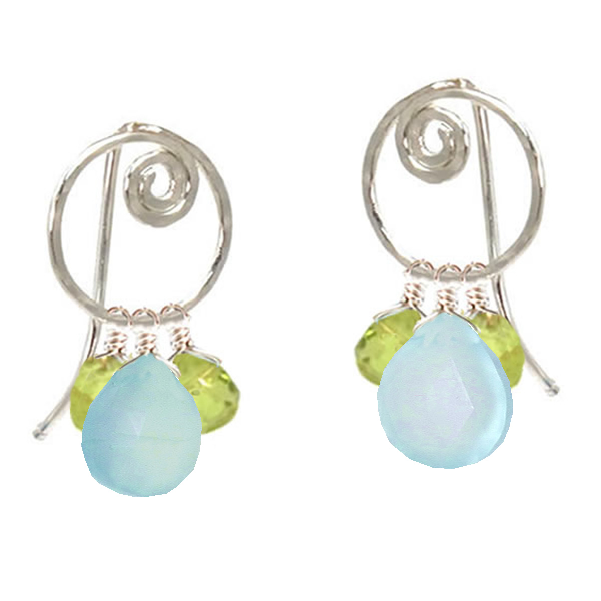 Peridot and sea blue chalcedony on curly posts, about 1-1/4" long.