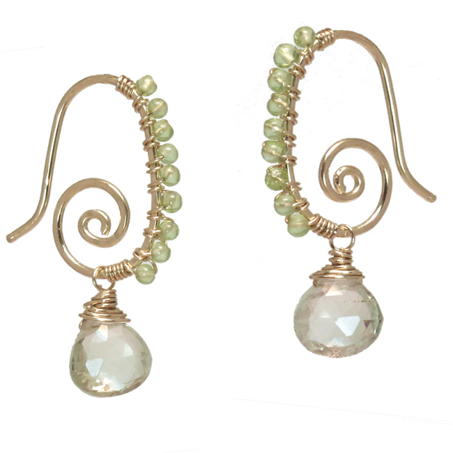 Hammered small spirals wrapped with peridot and green amethyst drops, about 1-1/4" long.