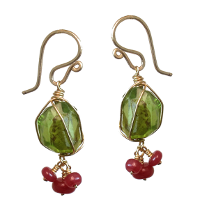 Peridot wrapped with ruby, about 1-1/4" long. Available in either 14K gold-filled, rose gold-filled, or sterling silver.