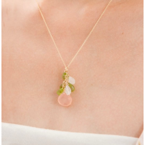 Cluster of faceted pale rose quartz and peridot with large rose chalcedony, about 18". Contact us for different lengths.