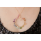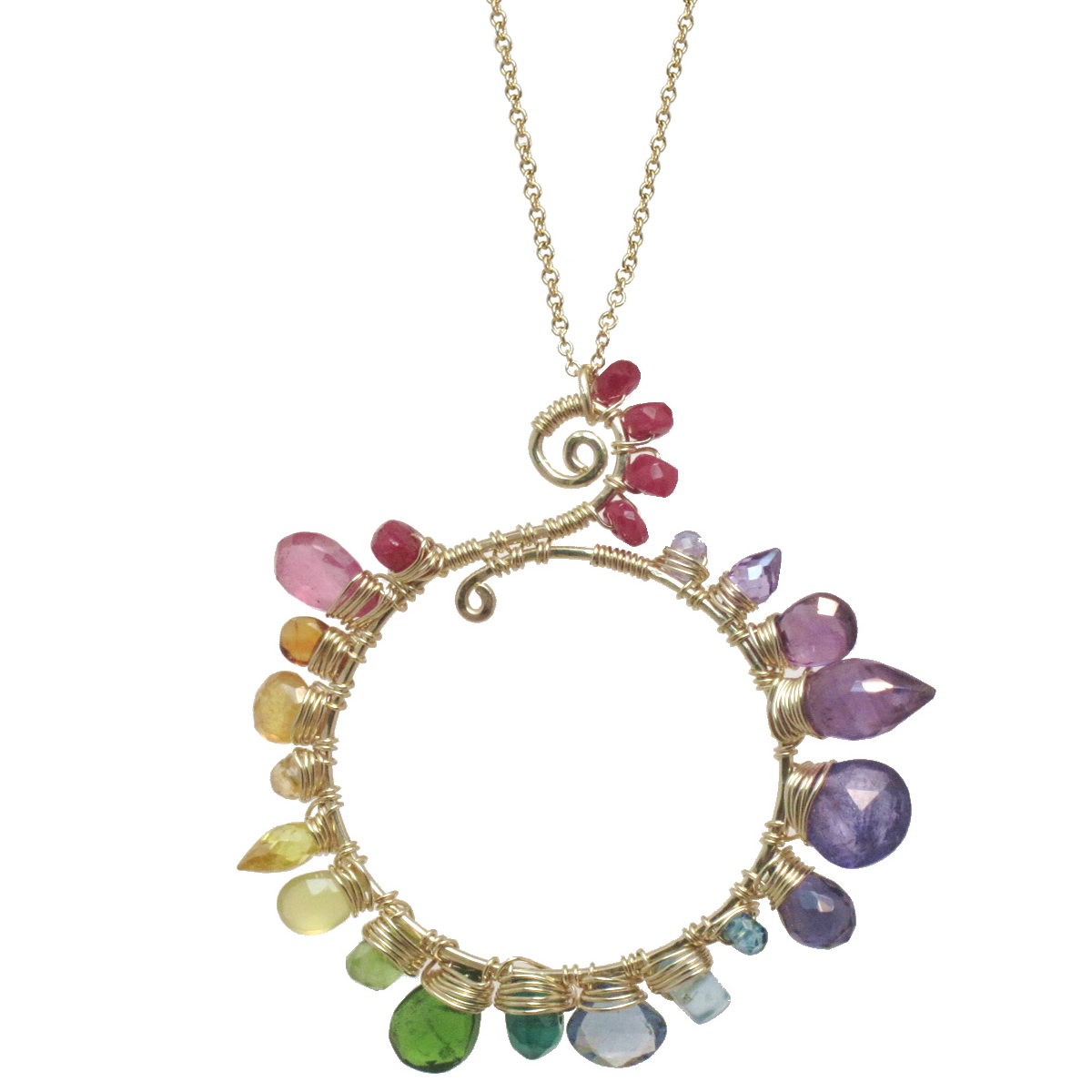 Hammered circle wrapped with pink ruby, citrine, orange sapphire, yellow sapphire, peridot, chrome diopside, tanzanite, blue topaz, amethyst, on multi-chain, about 18" (circle part is about 1-3/4"). Contact us for different lengths.