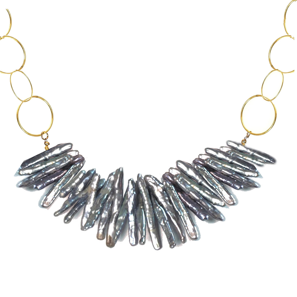 Pewter biwa stick pearls on large hammered chain, about 18". Contact us for different lengths.