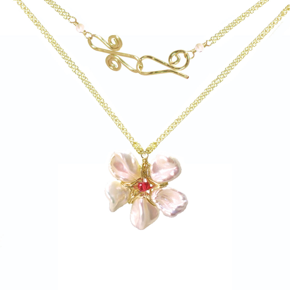 Keshi pearl flower with choice of center stone, about 18". Contact us for different lengths.