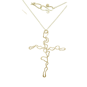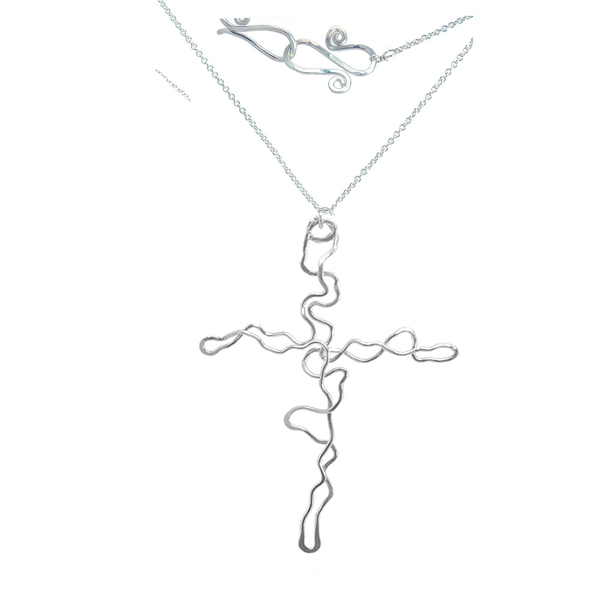 Hammered squiggle cross on fine chain, about 18", pendant about 2" long. Contact us for different lengths.