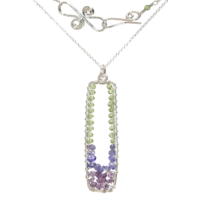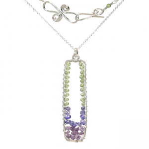 Hammered rectangles with peridot, tanzanite, and amethyst wrapped inside, about 18" long (rectangle about 2"). Contact us for different lengths.