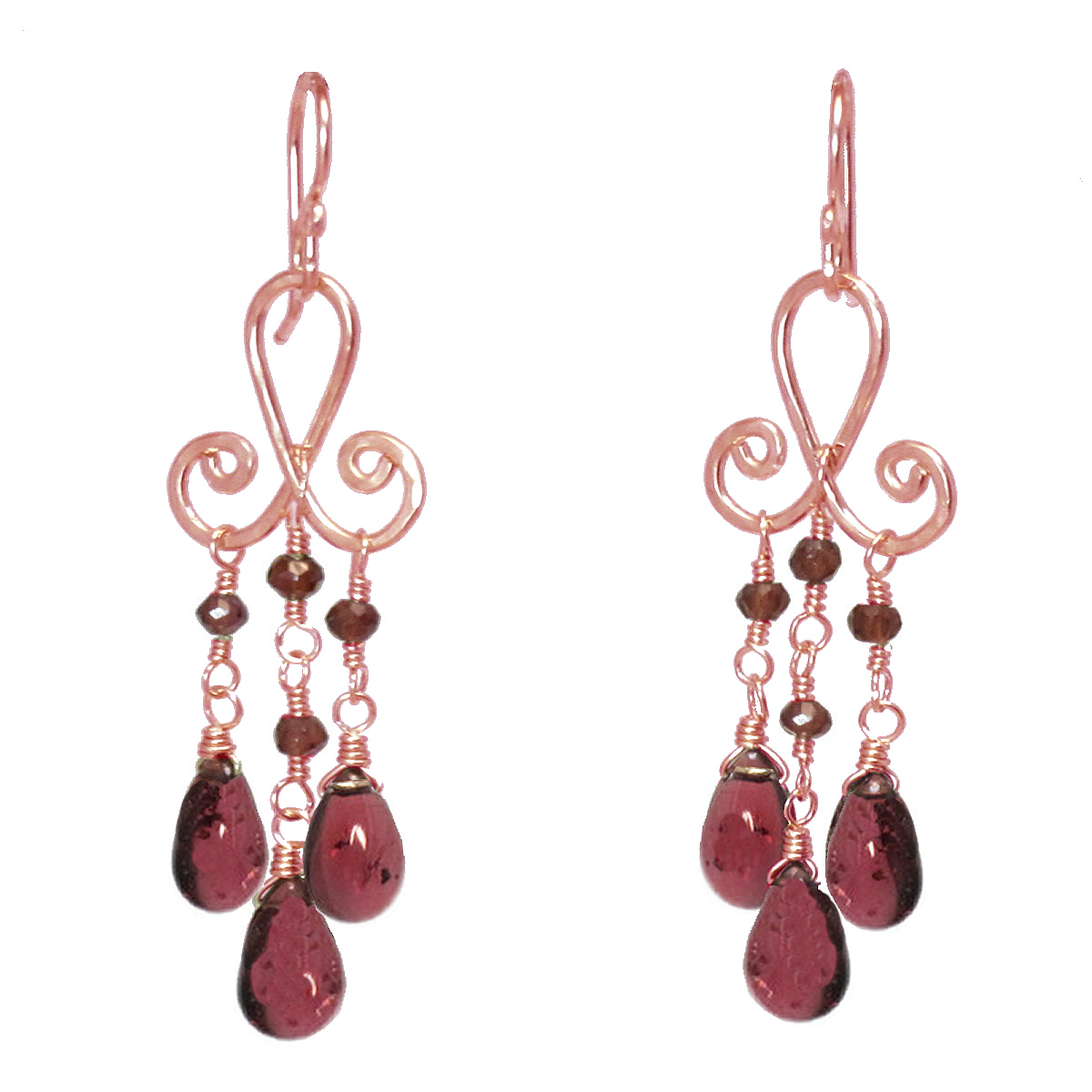 Garnet on curled hammered wire, about 2" long.