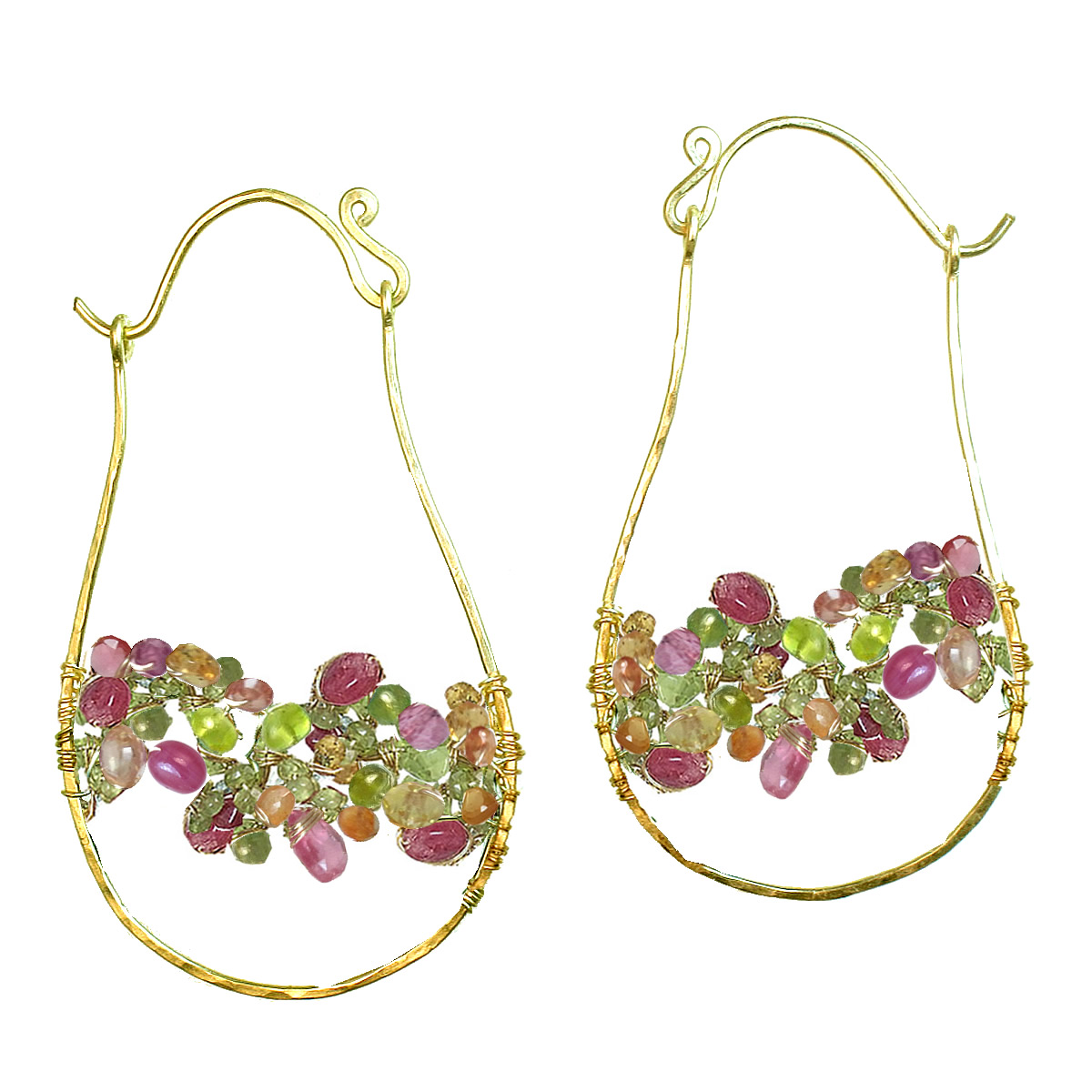 Hammered drop shapes wrapped with peridot, vessonite, and ruby, about 2". Available in either 14K gold-filled, rose gold-filled, or sterling silver.