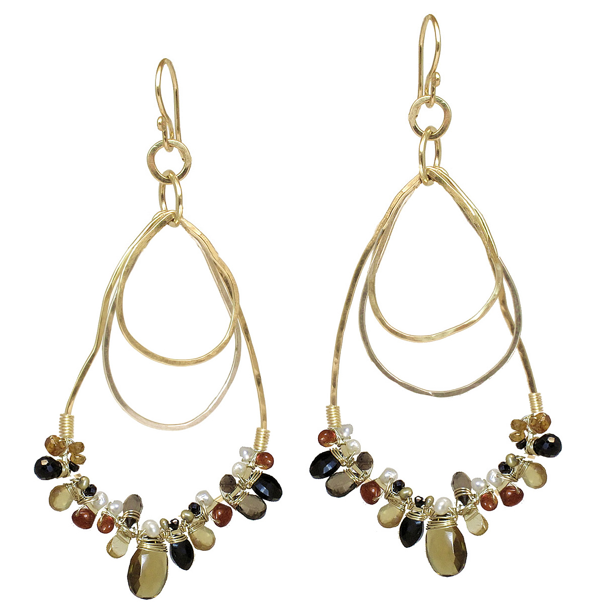 Hammered drop shapes wrapped with black spinel, mandarin garnet, whiskey quartz, smoky quartz, about 2".