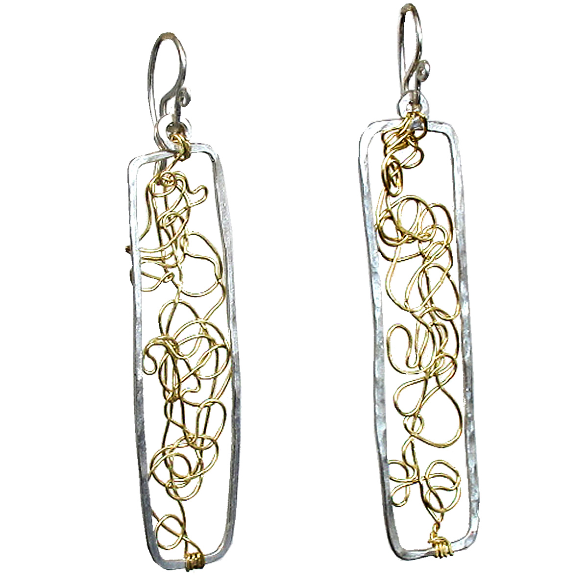 Hammered rectangles wrapped with squiggly wire, about 2" long.