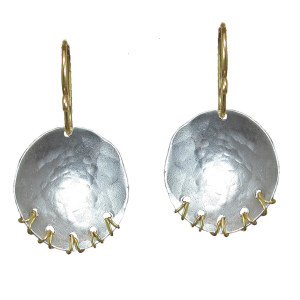 Hammered discs wrapped with squiggly wire, about 1-1/4" long.