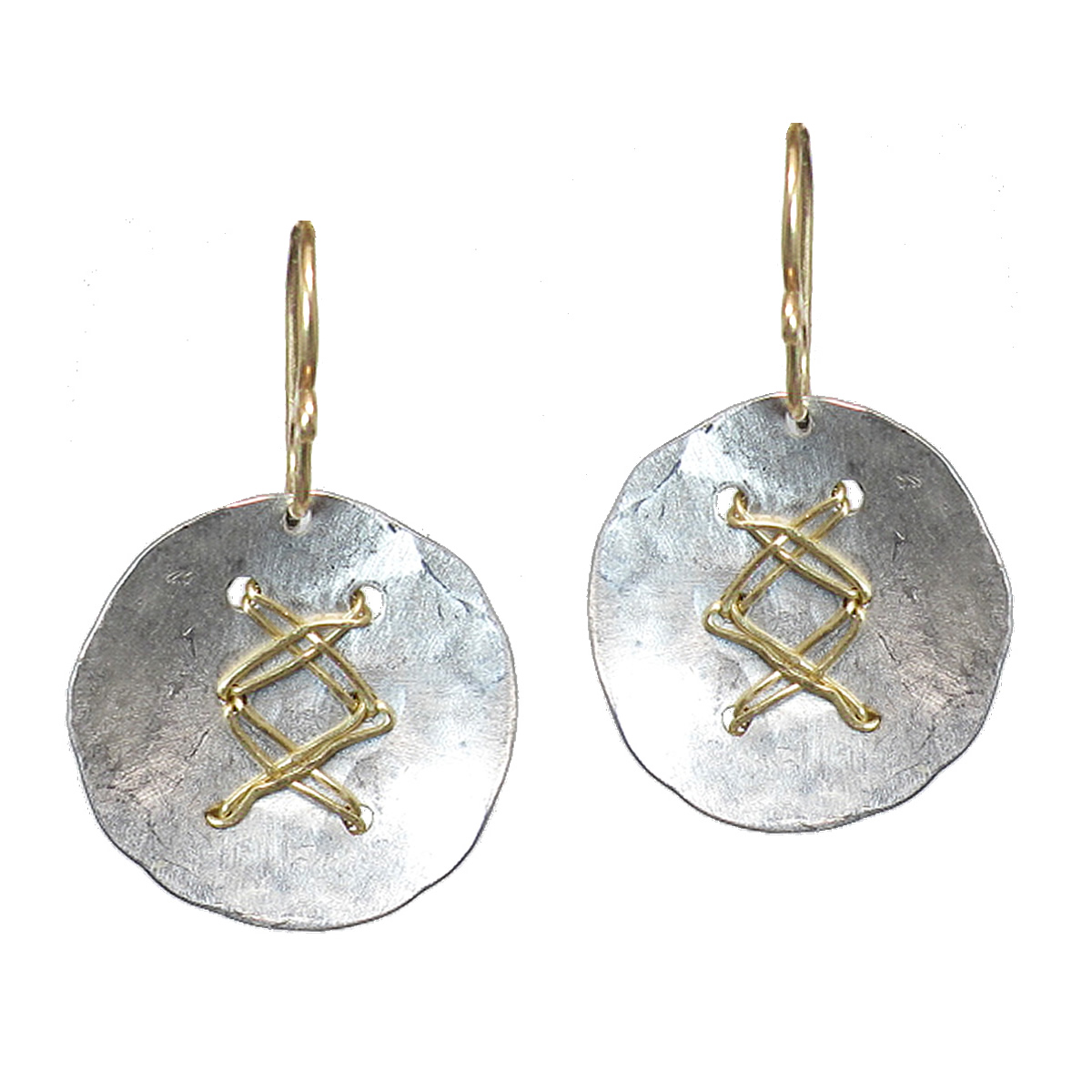 Hammered discs wrapped with wire, about 1-1/4" long.