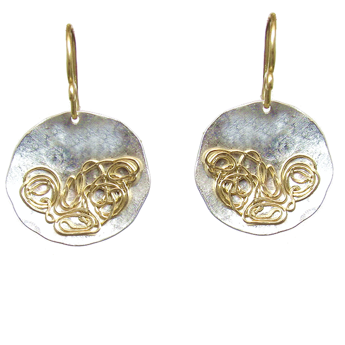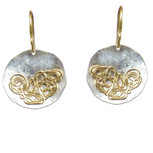 Hammered discs wrapped with squiggly wire, about 1-1/4" long.