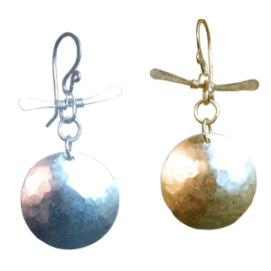 Hammered discs on hammered bar, about 1-1/2" long. Your choice of convex (rounded out) or concave (rounded in) facing forward.
