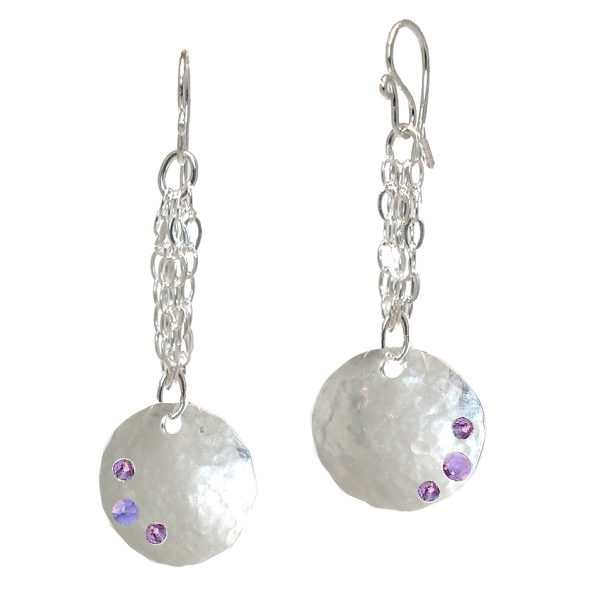 Hammered discs on chain with amethyst, about 2" long.