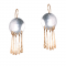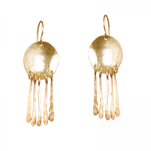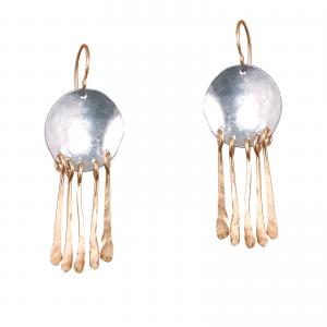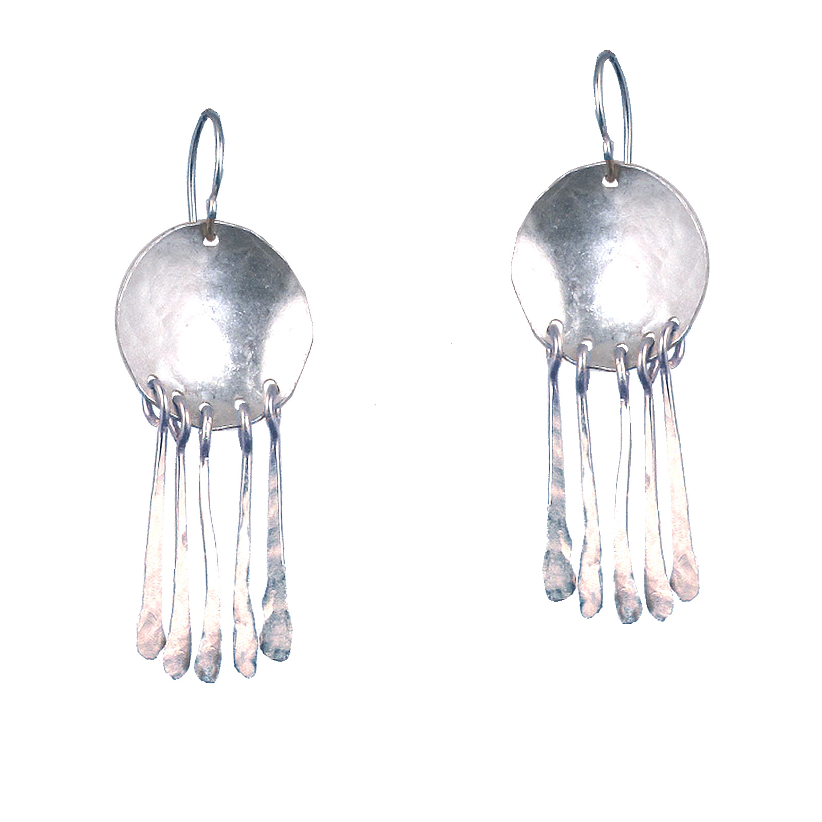 Hammered discs with dangling spikes, about 2-1/4" long. Choice of same or mixed metals.