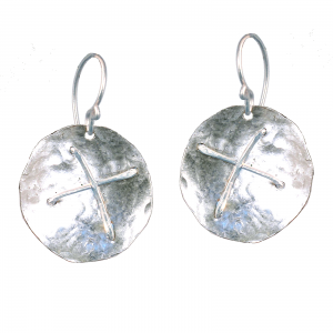 Hammered discs with wire wrapping, about 1-1/4" long. Choice of same or mixed metals.
