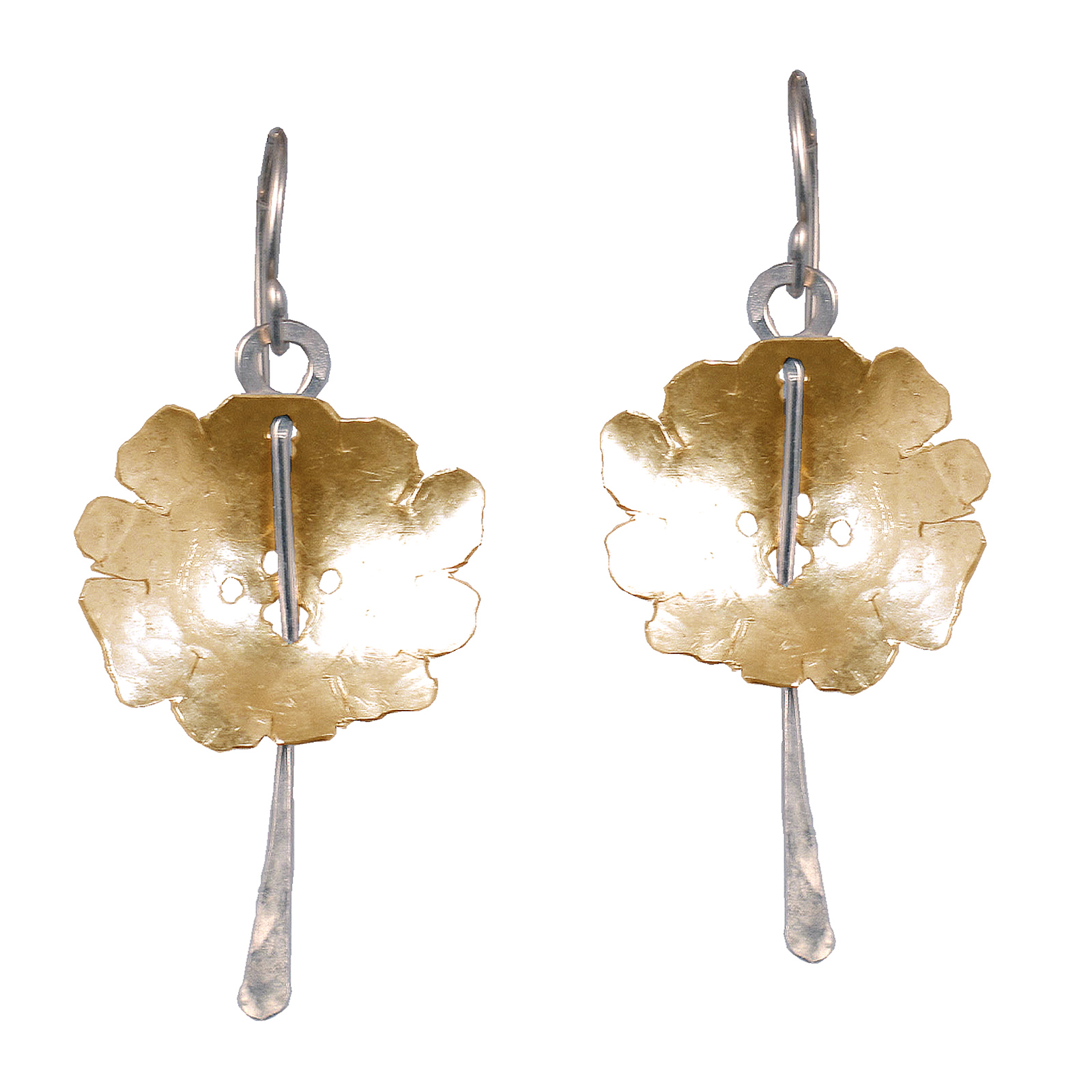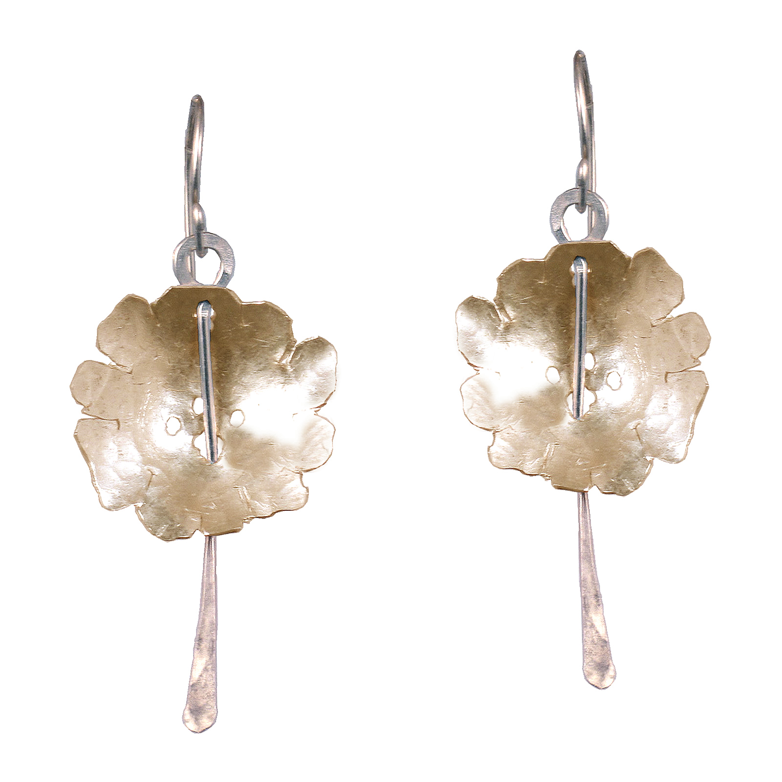 Hammered discs with dangling spike, about 2-1/4" long. Choice of same or mixed metals.