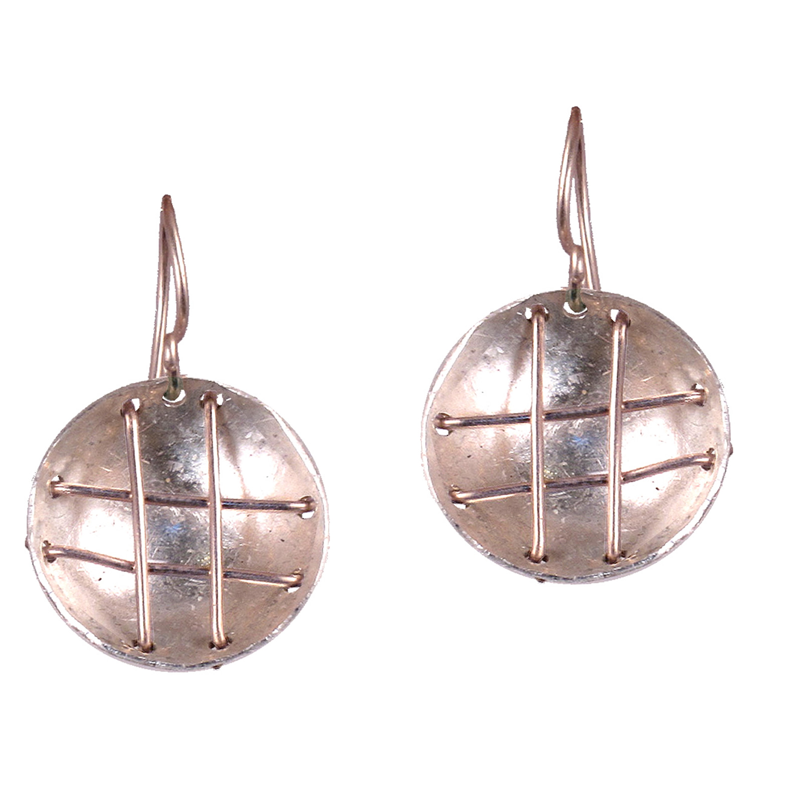 Hammered discs with wire wrapping, about 1-1/4" long. Choice of same or mixed metals.