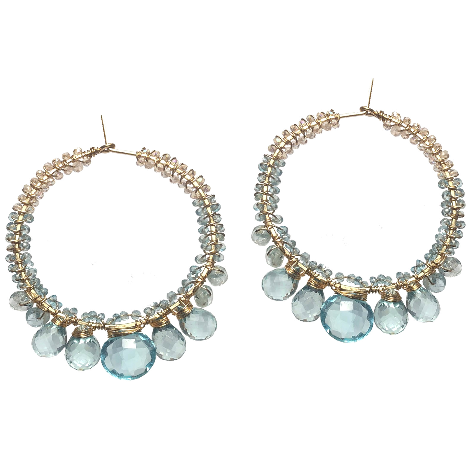 Hammered hoops wrapped with aquamarine, apatite, and london blue quartz, about 1-3/4" diameter.