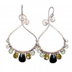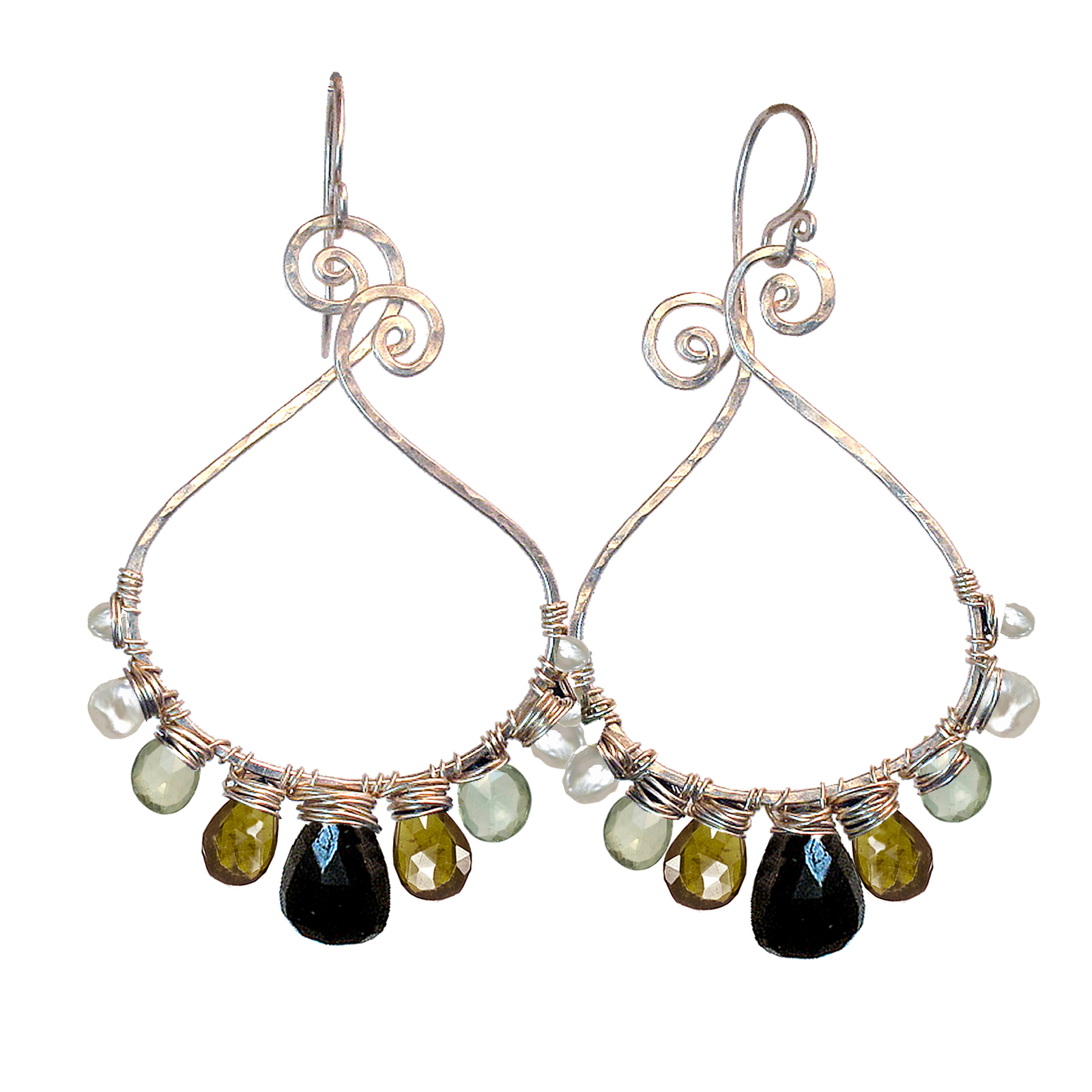 Hammered drop hoops wrapped with pearls, green amethyst, vessonite, and black onyx, about 1-3/4" long.