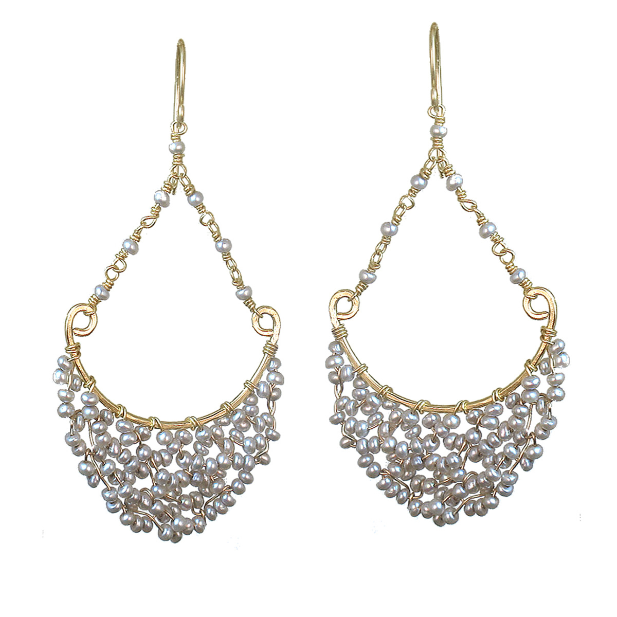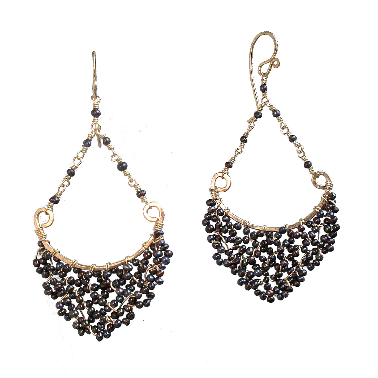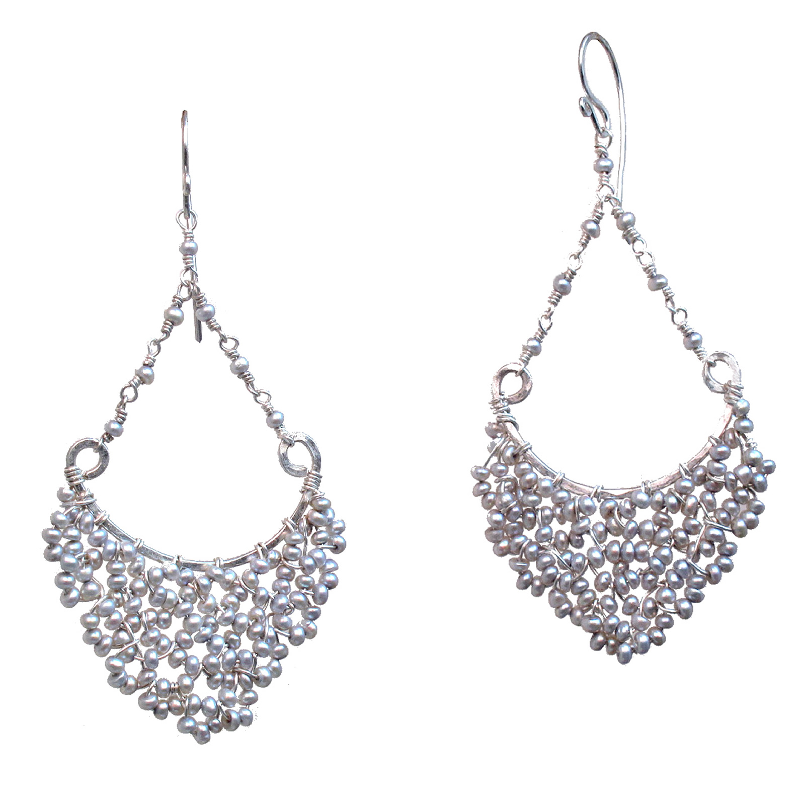 Your choice of seed pearl wrapped on hammered chandelier shapes (pewter and black peacock pearl shown), about 2-1/2" long.