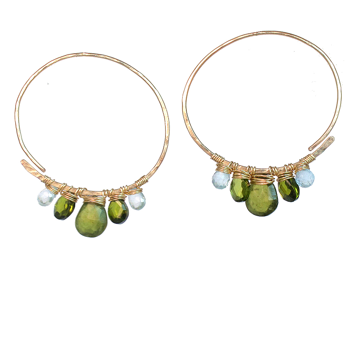 Open hoops wrapped with aquamarine, peridot, and vessonite, about 1-3/4" long.