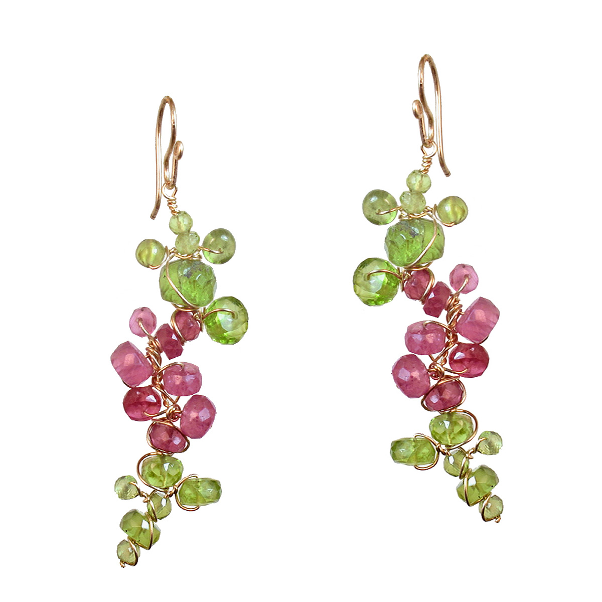 Wrapped branches of peridot and pink ruby, about 2-1/4" long.