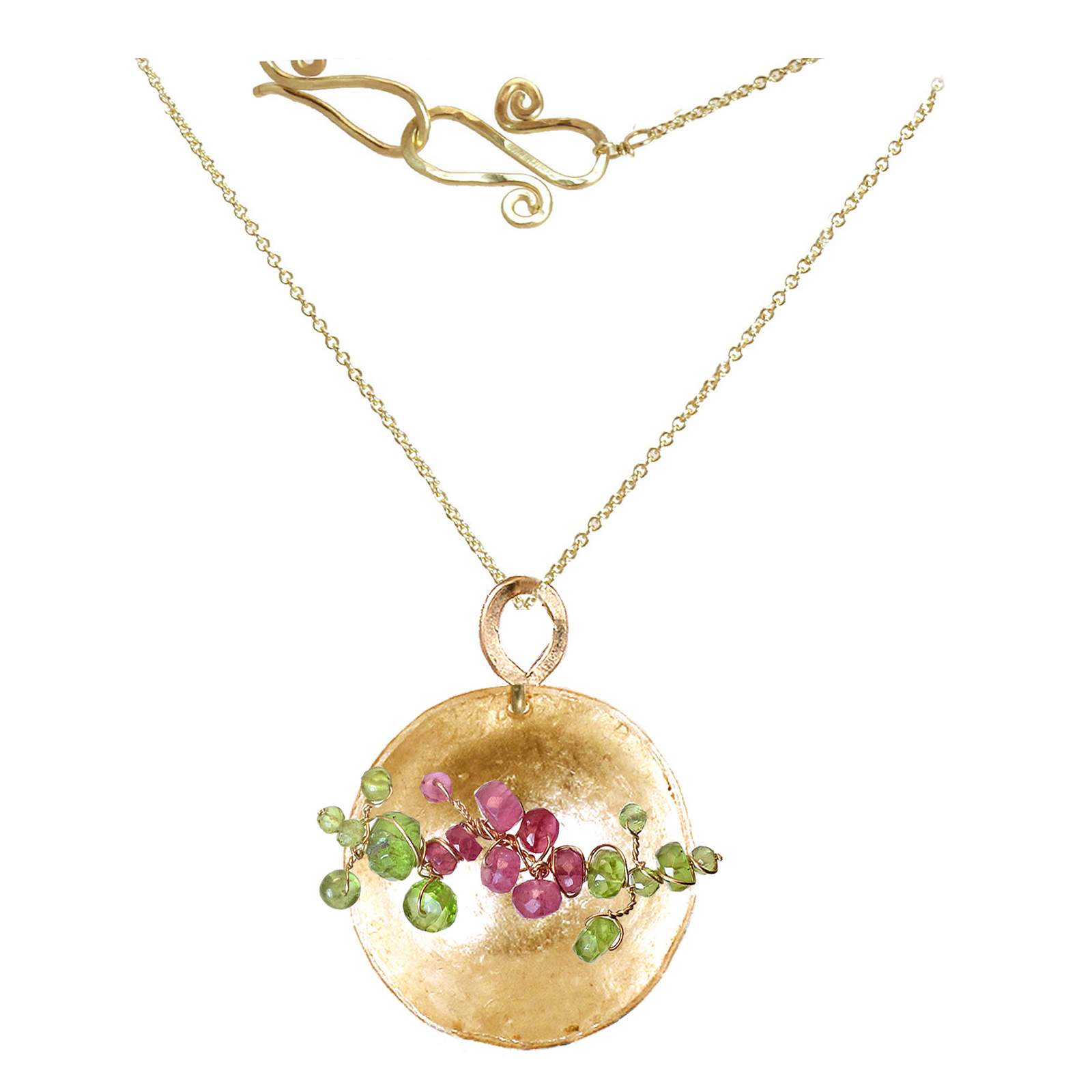 Hammered disc with cluster peridot and ruby on chain, about 18". Contact us for different lengths.
