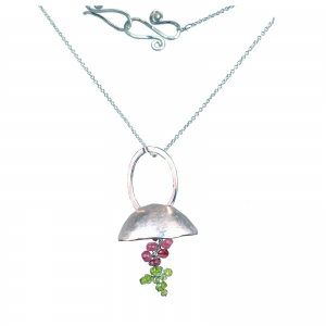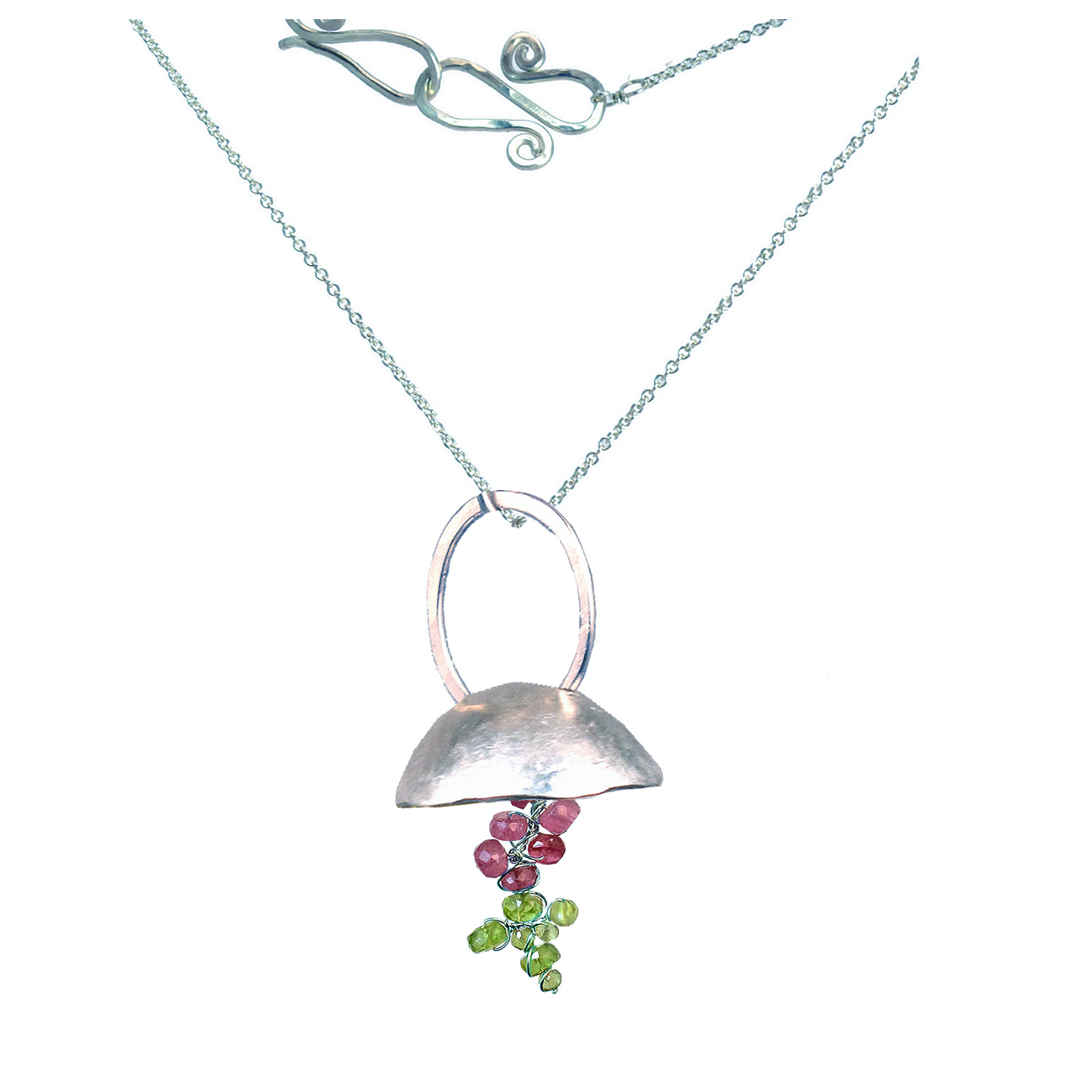 Hammered disc with cluster peridot and ruby on chain, about 18". Contact us for different lengths.