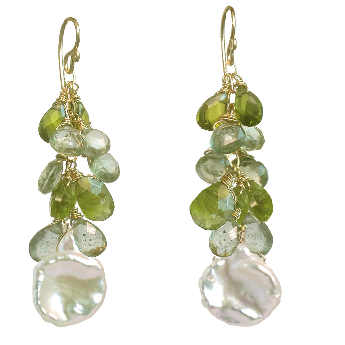 Peridot, moss aquamarine, and white keshi pearls, about 2-1/4" long.