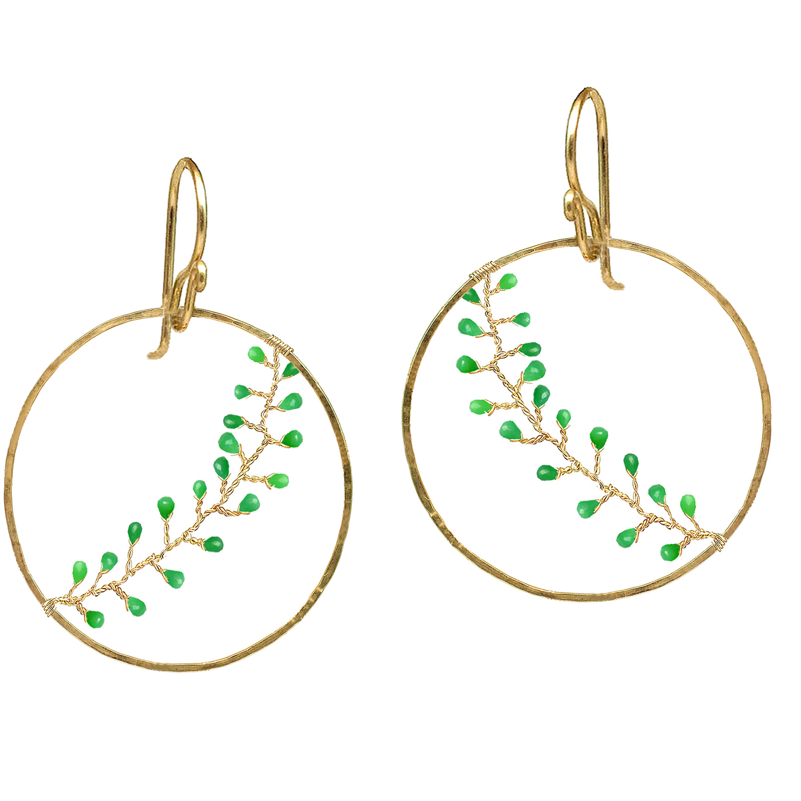 Hammered hoops with twisted vines of chrysoprase, 1-3/4" long.