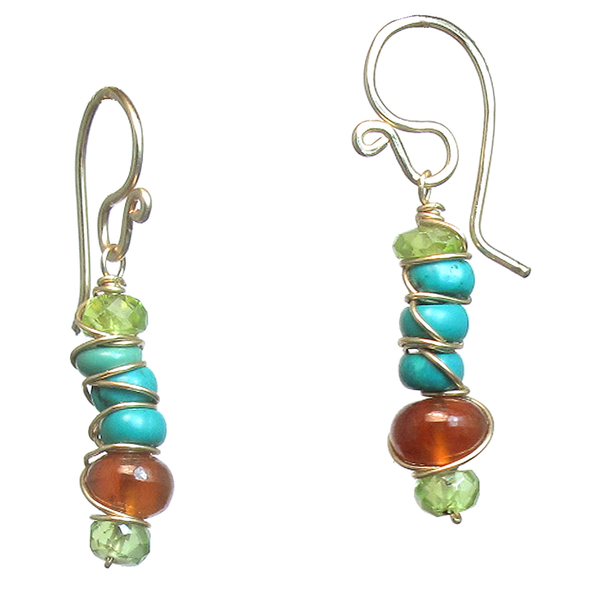 Wrapped peridot, turquoise, and amber, about 1-1/2" long.
