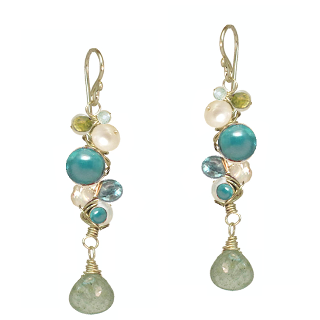 Branches of peridot, pearl, apatite, turquoise, and moss aquamarine, about 1-3/4" long.