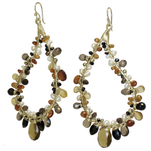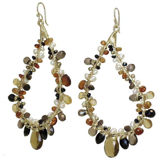 Hammered paisley shapes wrapped with pearls, smoky quartz, whiskey quartz, citrine, mandarin garnet, and black spinel, about 2-1/2".