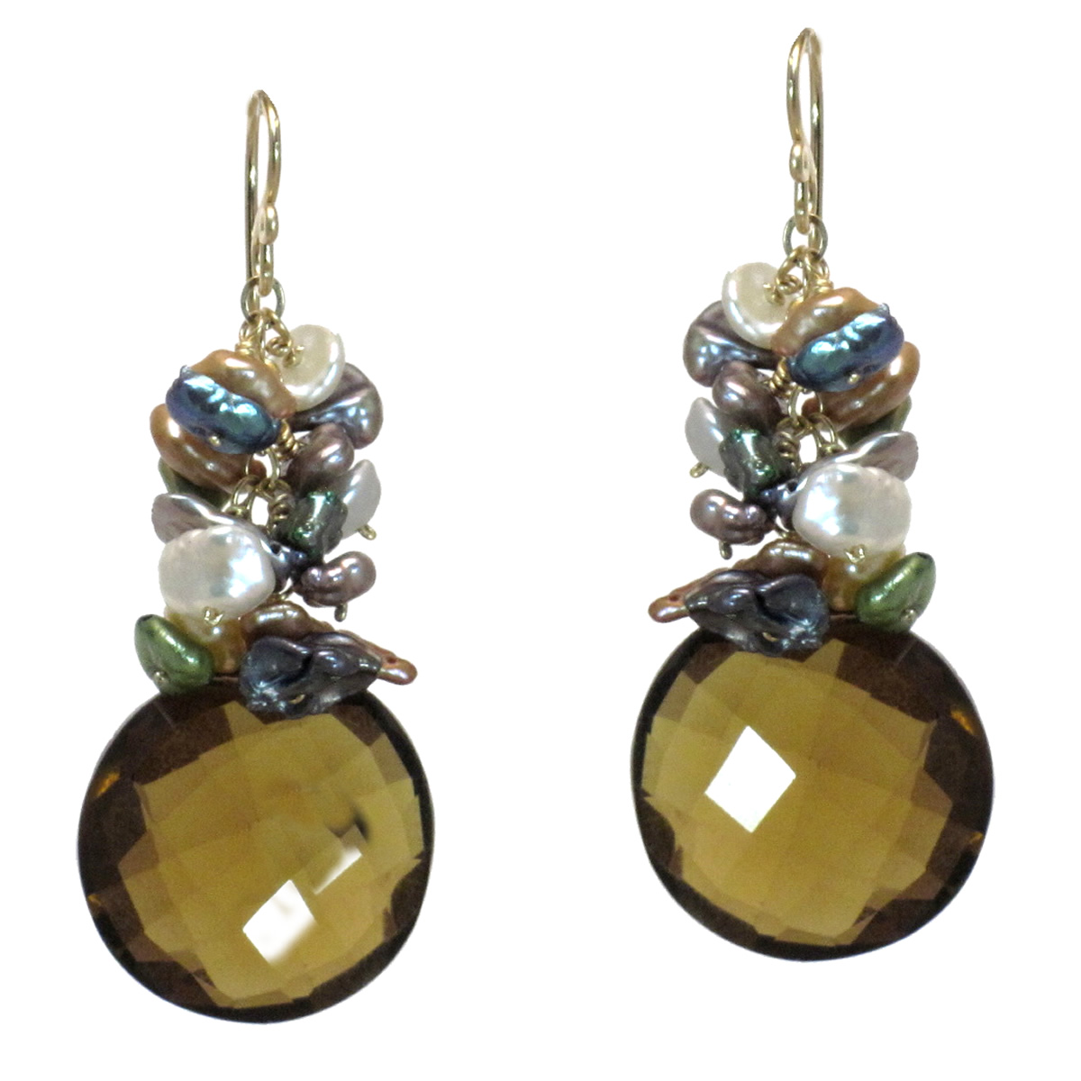Clusters of mixed pearls and round whiskey quartz, about 1-3/4" long.