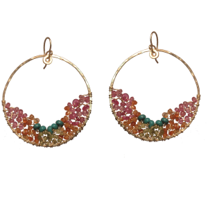 Large hammered circles wrapped with pink ruby, mandarin garnet, peridot, and turquoise, about 2" long.