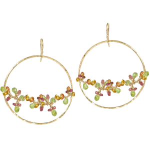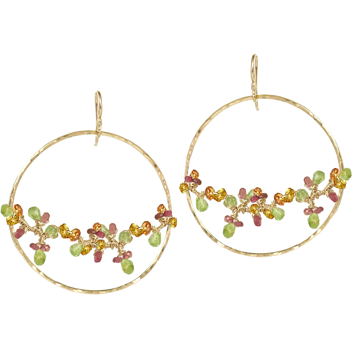 Hammered circles wrapped with peridot, pink ruby, and mandarin garnet, about 2" long. Available in either 14K gold-filled, rose gold-filled, or sterling silver.