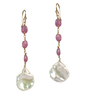 Pink ruby with ivory keshi pearls, about 2-1/4" long.