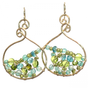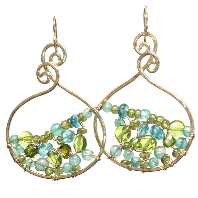 Large hammered swirl drops wrapped with turquoise, green garnet, and green tourmaline inside, about 2" long.