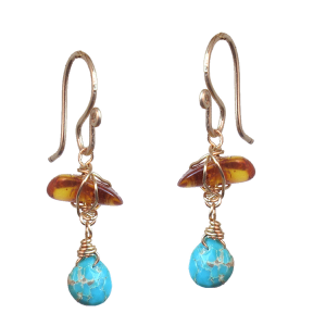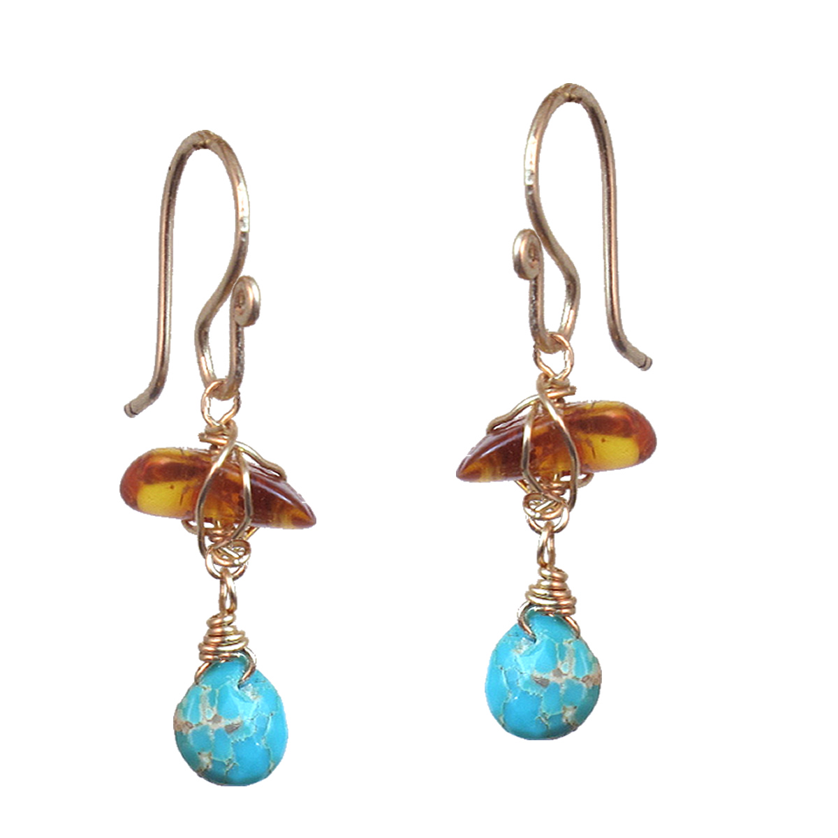 Wrapped amber linked with arizona turquoise, about 1-1/4" long.
