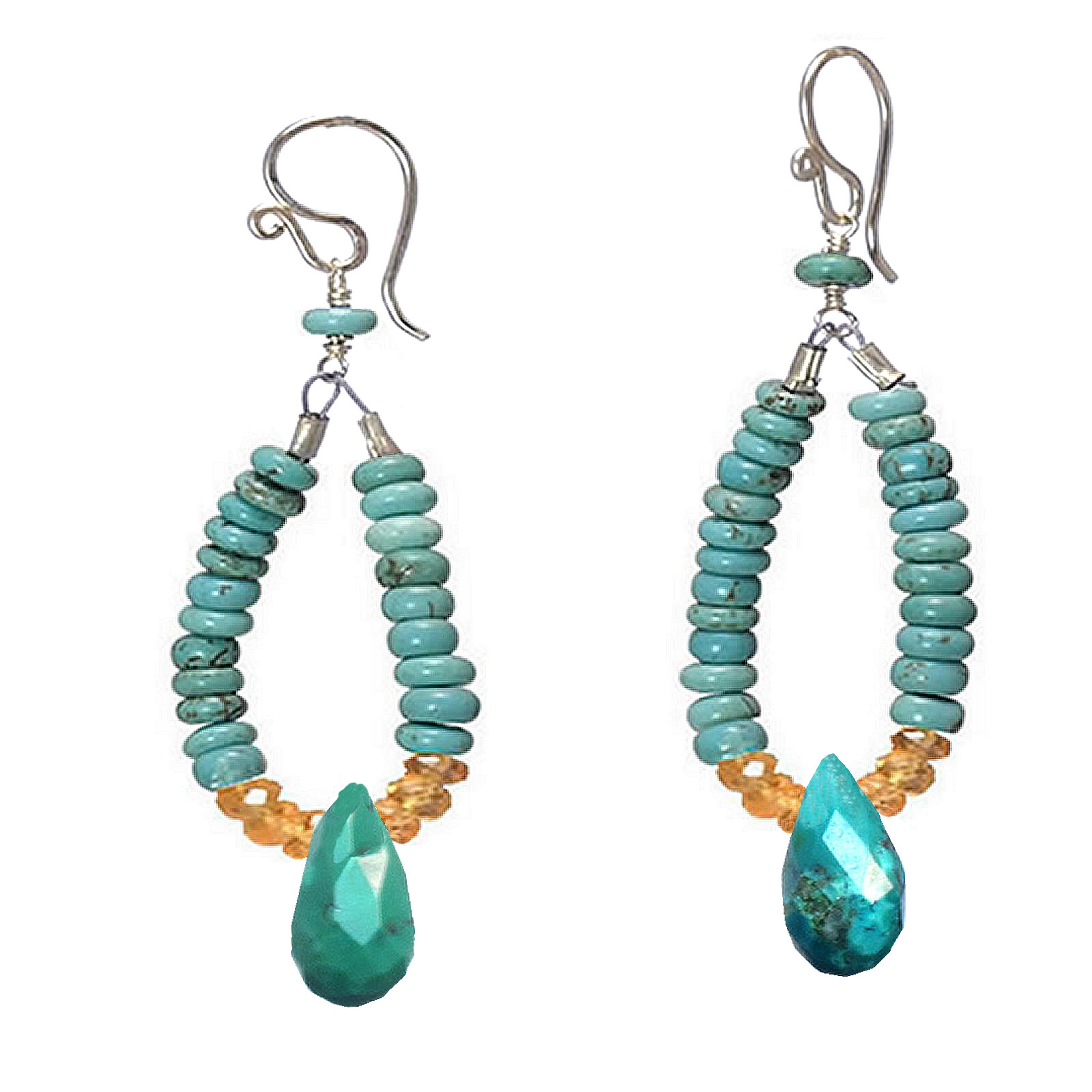 Turquoise beaded drops with mandarin garnet and turquoise, about 2" long.