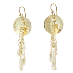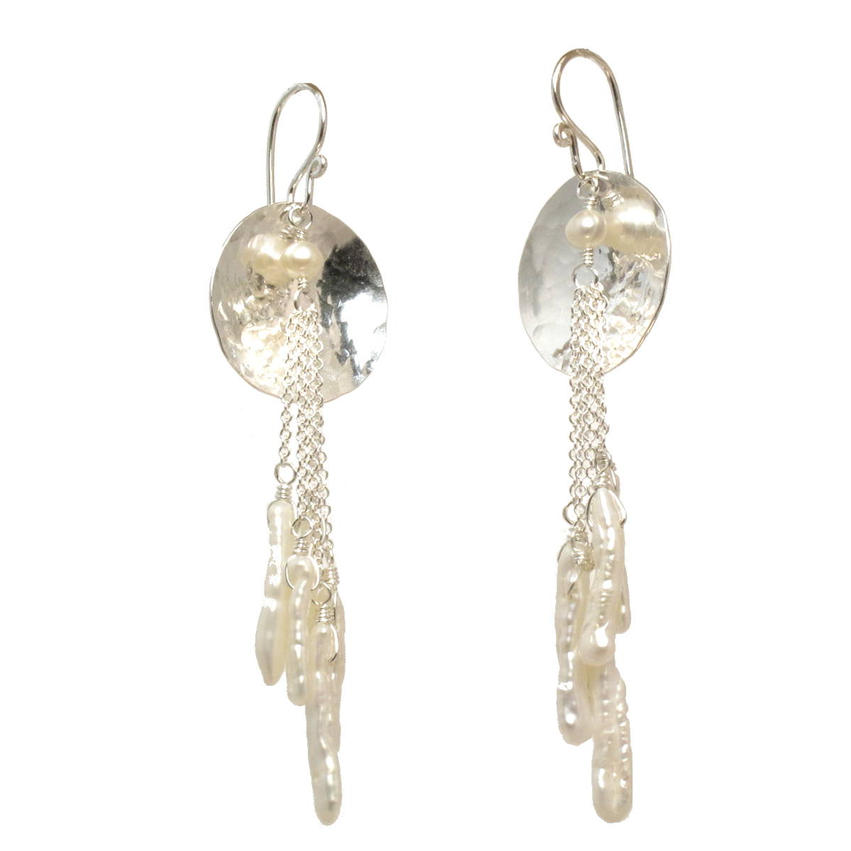 Hammered discs with white biwa pearls, about 1-3/4" long.