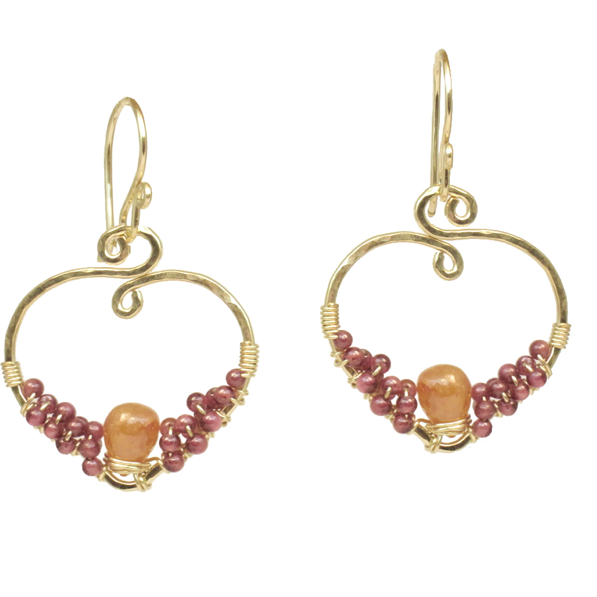 Hammered wrapped drops with wine garnet and mandarin garnet, about 1-1/2" long.