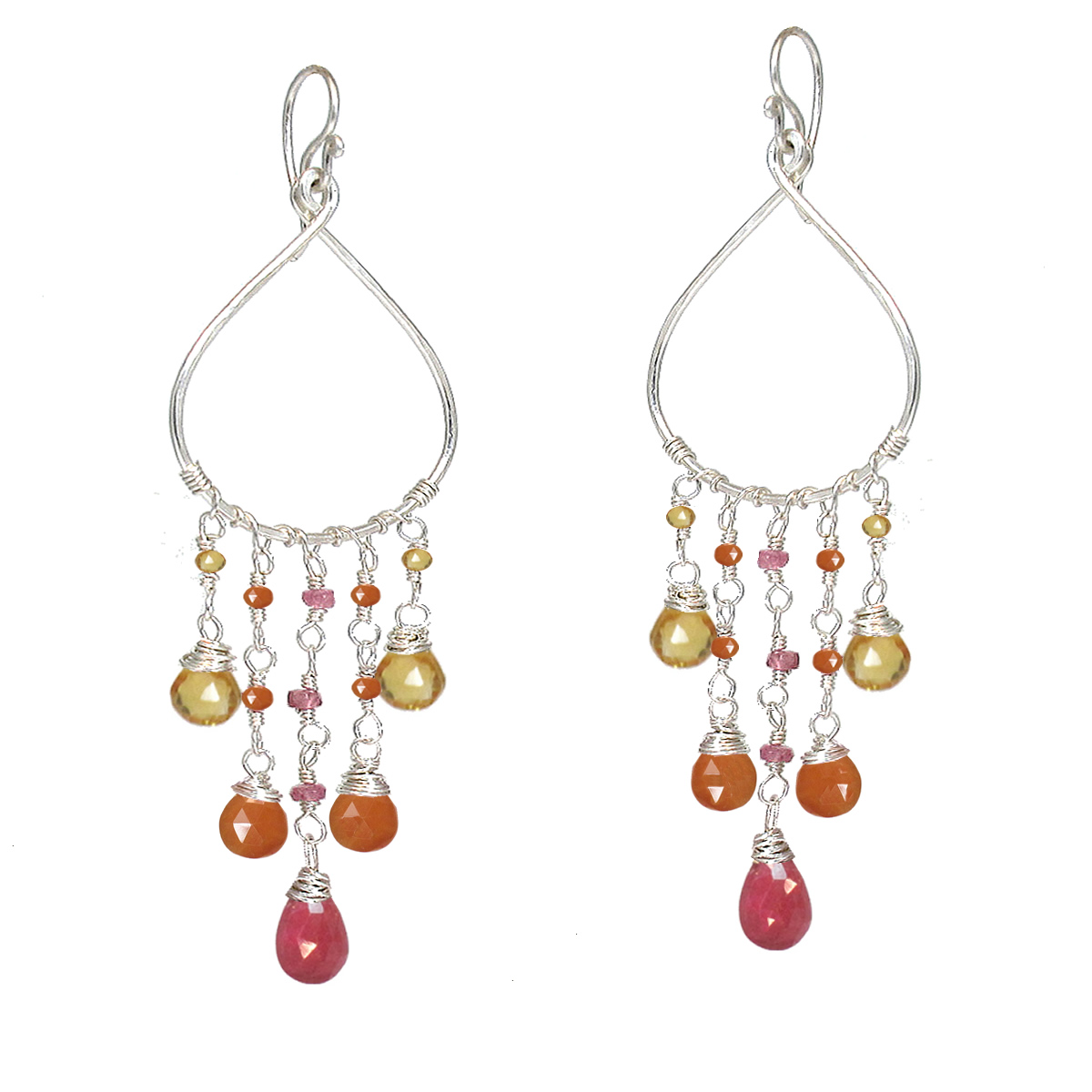 Citrine, carnelian, and pink ruby on hammered drops, about 3" long.